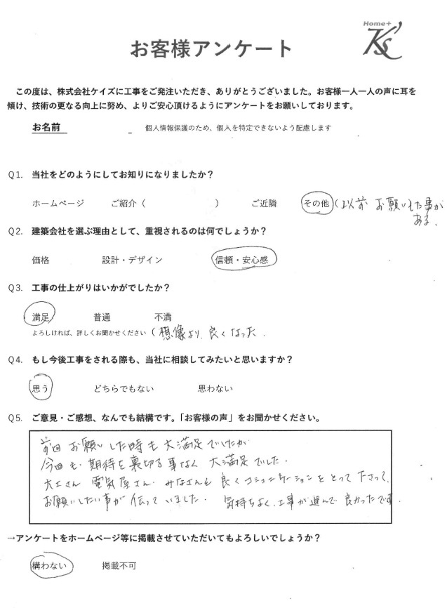 大工さん 電気屋さん、みなさんも良くコミュニケーションをとって下さってお願いしたい事が伝わっていました。